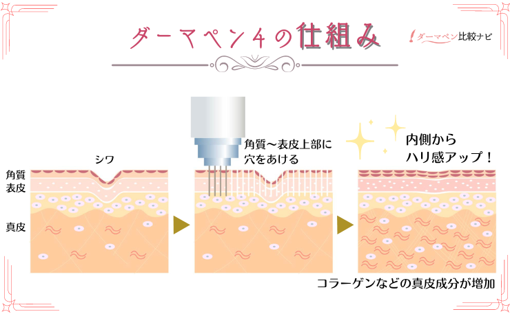 ダーマペンで1秒間に1920個の微小な穴を開け、傷ついた皮膚を修復しようとする働きを促します。