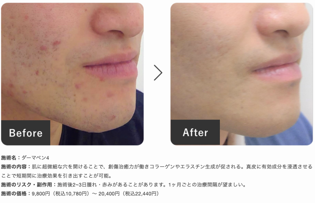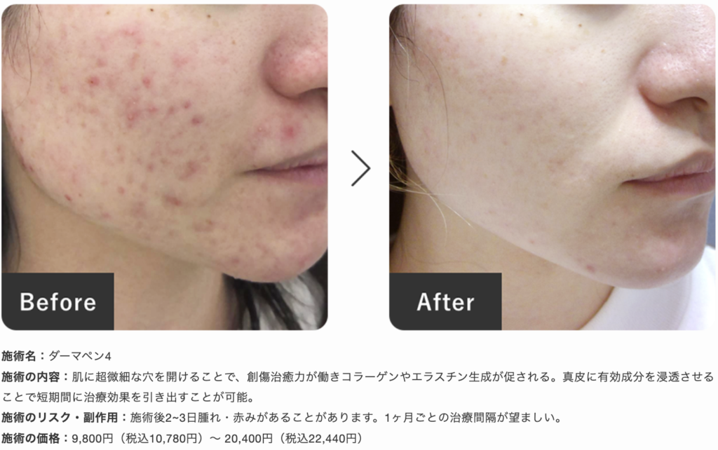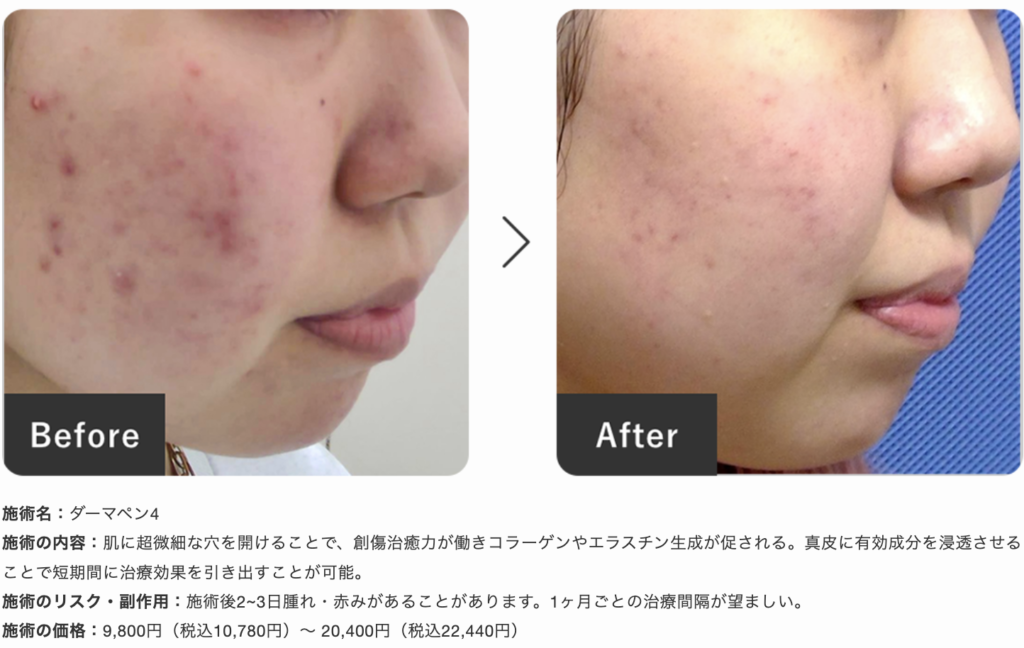 施術名:ダーマペン4施術の説明:微細な針で肌に高密度に穴を開けて、コラーゲンを増やし、真皮にヒアルロン酸や成長因子を直接導入できるため、より短時間で治療効果を引き出す事ができます。施術の副作用(リスク):疼痛・発赤・色素沈着・肝斑増悪・ざ瘡悪化を生じる可能性があります。施術の価格:11,000円~126,000円※本施術は公的医療保険制度が適用されない自由診療です【引用】湘南美容クリニック