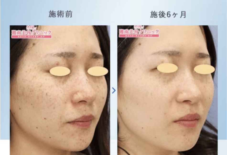 この症例では、頬全体に小さなシミがたくさんありました。施術を受けたあとにはシミが目立たなくなり、肌のハリ感までアップしています。